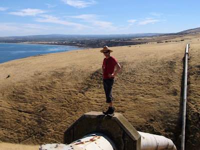 Following the cliff edge didn't last long, we soon headed further inland to the easier route of following a pipeline across farmland. There were numerous steep gullies making their way to the coast, and this route further inland made it a bit easier. There was one particularly steep gully, there was no service road for the water pipe to follow. The dry grass was quite slippery, and the weather conditions hot, as we slowly crawled down the gully.